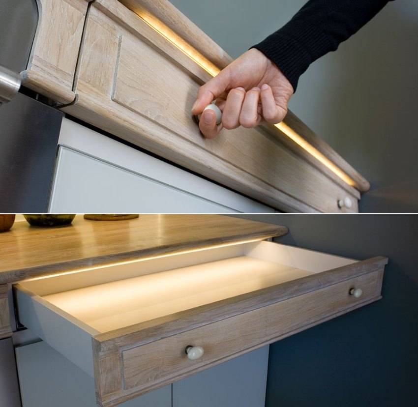 В современном мире, существует множество технологий. Например: внутренняя подстветка ящиков. Это достаточно удобно и практично. Такой свет можно оформить на все ящики кухни или отдельно на выбор. Если вы хотите наполнить вашу мебель еще большими технологиями, то это решения для Вас !